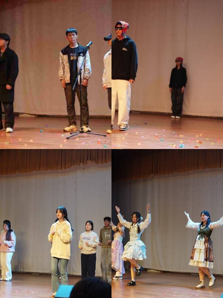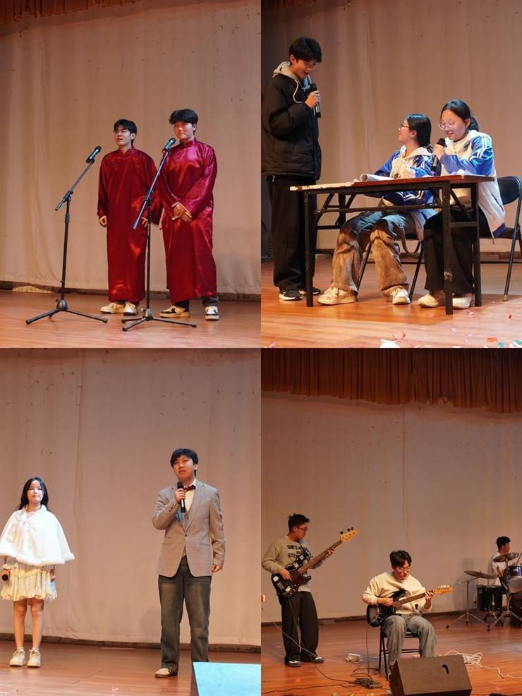 晚会现场,舞蹈、歌曲、相声、小品、乐队表演等节目各展风采。外联部的舞蹈《我的未来式》展现了朝气蓬勃的精神面貌;创服部赵成铭、于鋆带来的相声《恋爱那些事儿》妙语连珠,包袱不断;信息部的《舞蹈串烧》将多种舞蹈风格融合,动感的舞步掀起阵阵高潮;新媒体部的乐队表演由程浩轩领衔,用激昂的旋律点燃了全场热情。此外,《向阳而生》《西厢寻他》《素颜》等歌曲演唱婉转动听,《小花上学》小品充满童趣与温情,宣策部的《最炫民族风》舞蹈更是将现场氛围推向顶峰,欢快的节奏、整齐的动作,让台下观众忍不住跟着节拍挥舞手臂。