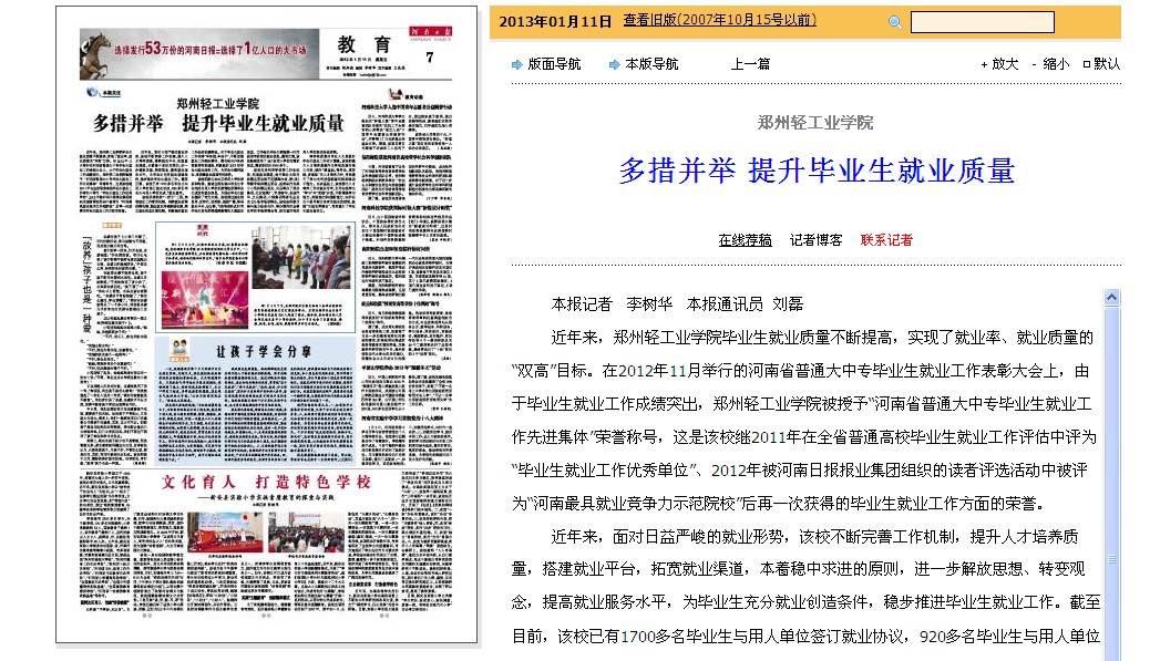 1月11日,《河南日报》教育版头条以“多措并举 提升毕业生就业质量”为题报道了我校多措并举,促使毕业生就业质量不断提高,实现了就业率、就业质量的“双高”目标。原文如下: