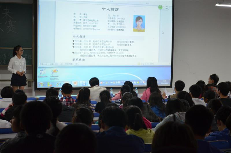 2014年4月24日下午14:00点,由计算机与通信工程学院大学生职业规划与就业促进办公室举办的“就业有’位’来-大学生简历设计大赛决赛”在科学校区软件楼118如期举行。本次大赛评委由学院学工办、分团委的马贝贝老师、吴佳老师,大学生就业与职业发展协会会长贾青彬,大学生社团联合会副书记谷嫣,<<轻院青年>>编辑部团支部书记张宝龙,计算机与通信工程学院就业办主任曹亚垒担任。