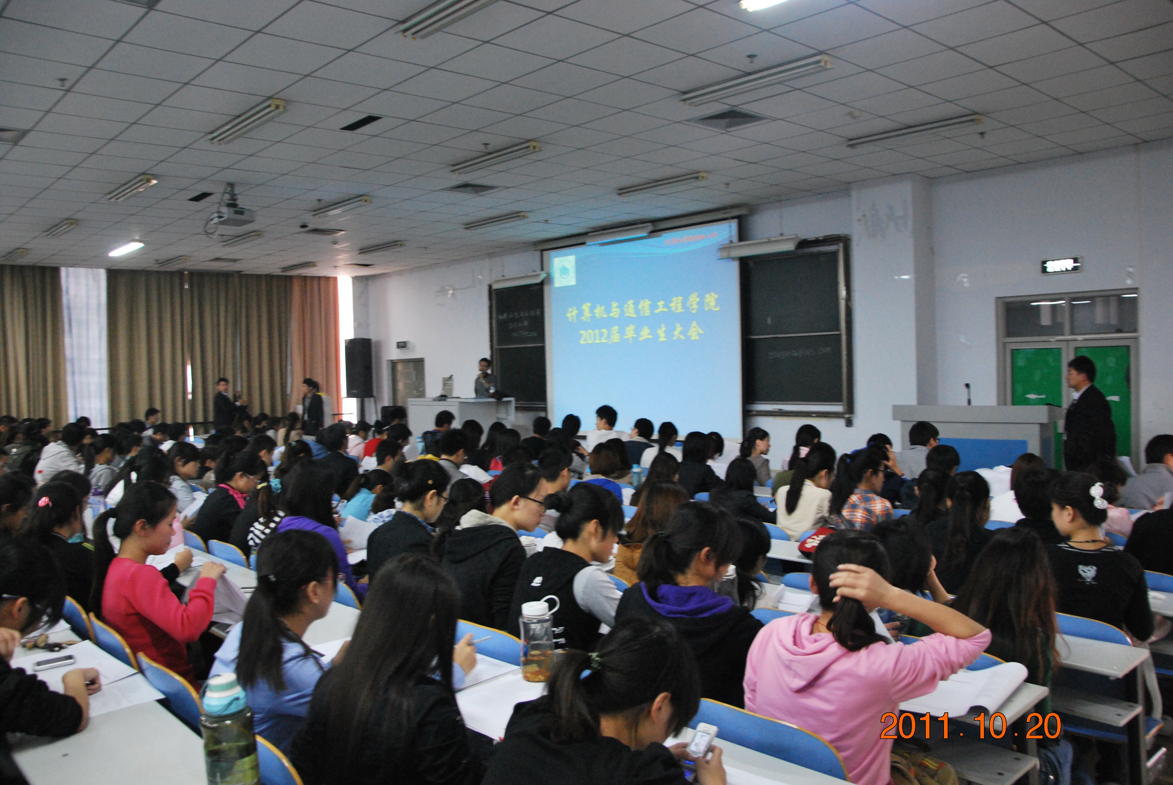 2011年10月20日,计算机与通信工程学院在教三楼302教室召开2012届毕业生就业工作动员大会。毕业班全体学生、主管就业的老师及毕业班辅导员老师参加大会,会议由学工办主任沈高峰老师主持。