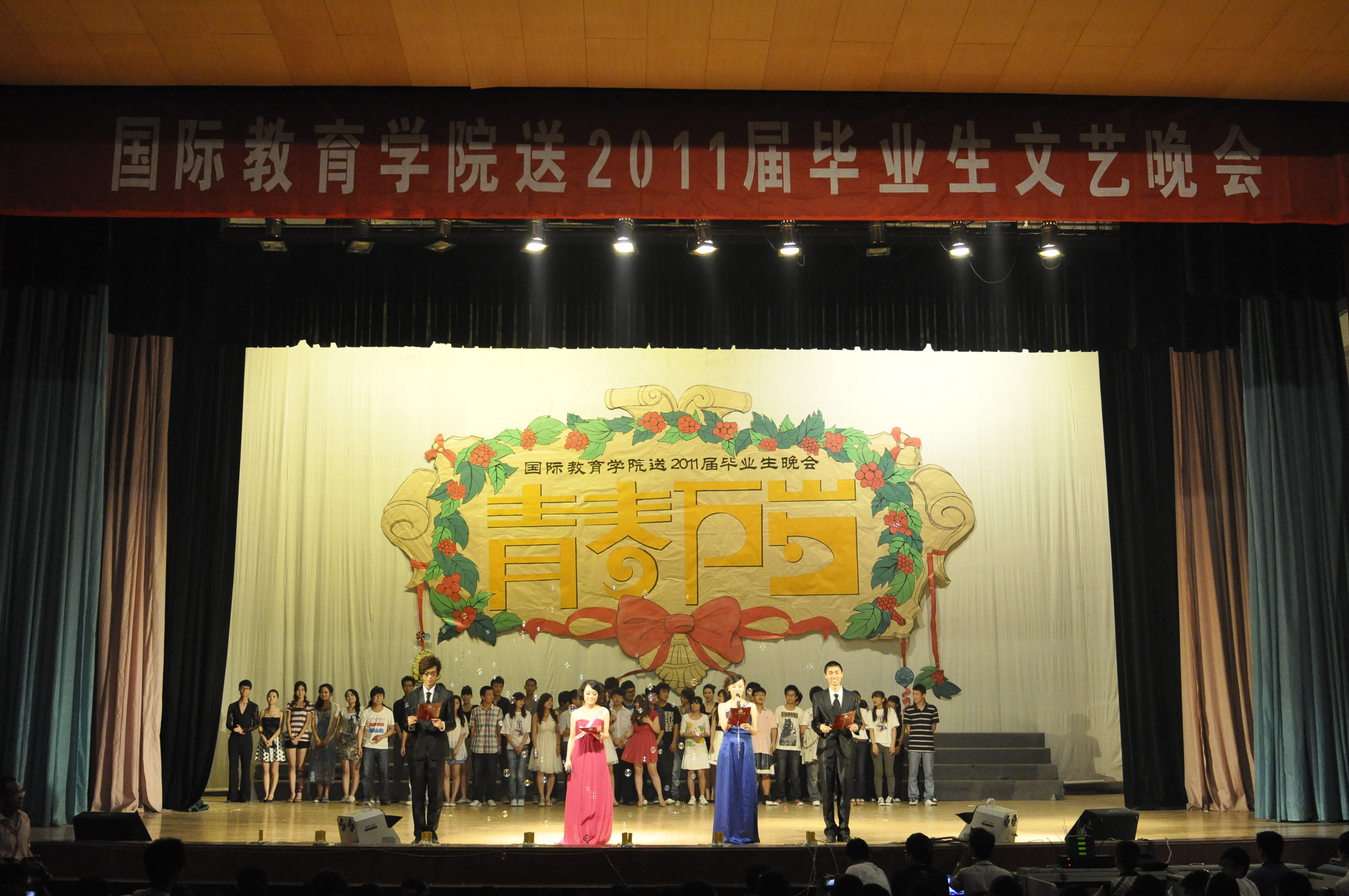 伴着青春的旋律,踏着青春的脚步。2011年5月28日,国际教育学院送2011届毕业生晚会在大礼堂隆重拉开序幕。
