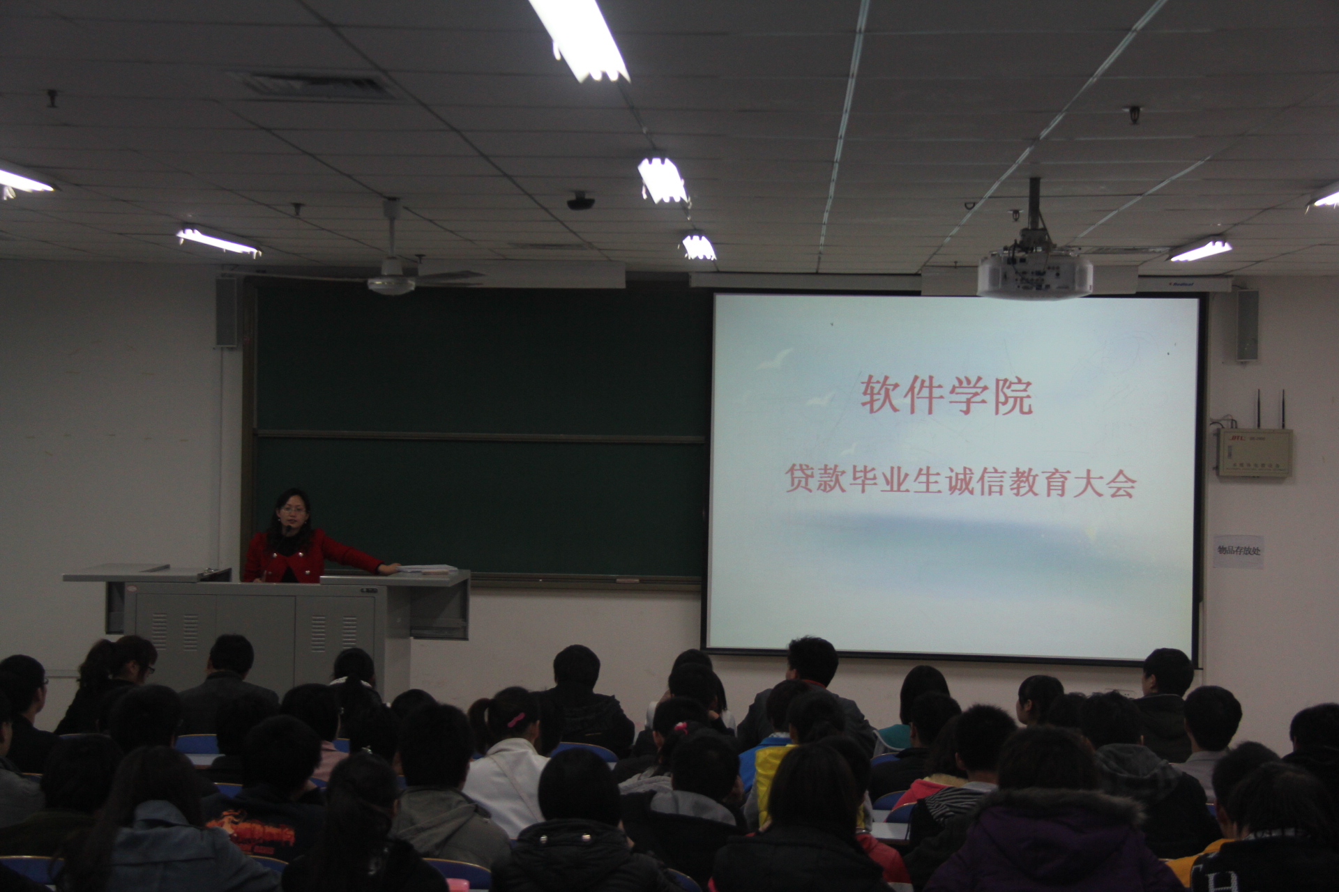 为了促进学生树立诚信观念,增强诚信意识,明确还款程序,3月28日晚,软件学院在电教楼102教室举行了2013年毕业贷款学生诚信教育大会。