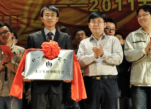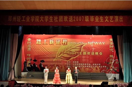 校团委副书记张超钦致开幕词,对全体毕业生表示最真挚的祝福,向一直以来关心和支持社团发展的老师、为社团发展做出卓越贡献的新老社团干部及为社团发展默默奉献的广大会员表示最衷心的感谢。他充分肯定了我校社团为校园文化的繁荣发展做出的贡献,并希望我校社团文化在今后的建设走“规范化、精品化、特色化”的道路。最后,正式宣布 “郑州轻工业学院社团管理指导委员会”成功更名为“郑州轻工业学院大学生社团联合会”并为其授牌。社团成员、毕业生代表胡明明、郭魁武、张�t鑫分别发表了他们的毕业感言。