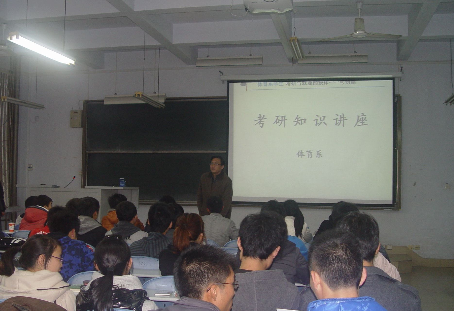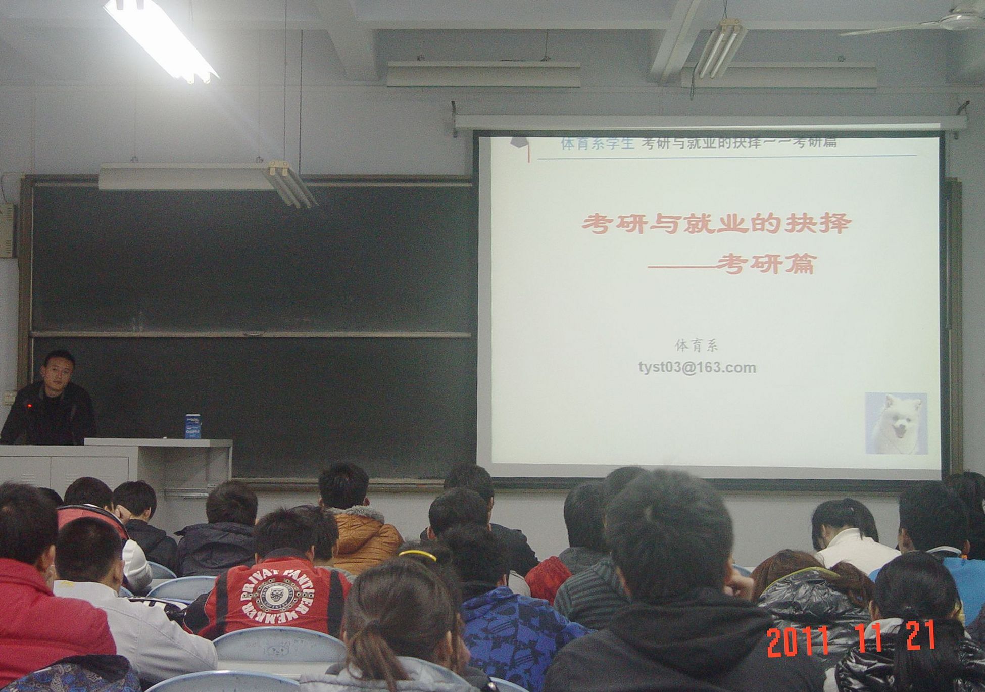 2011年11月21日下午,体育系在教三楼108室成功举办“考研与就业的抉择――考研篇”知识讲座。体育系总支副书记、专业任课教师代表、负责就业工作辅导员、考入重点大学毕业生代表和体育系全体学生参加了此次讲座。