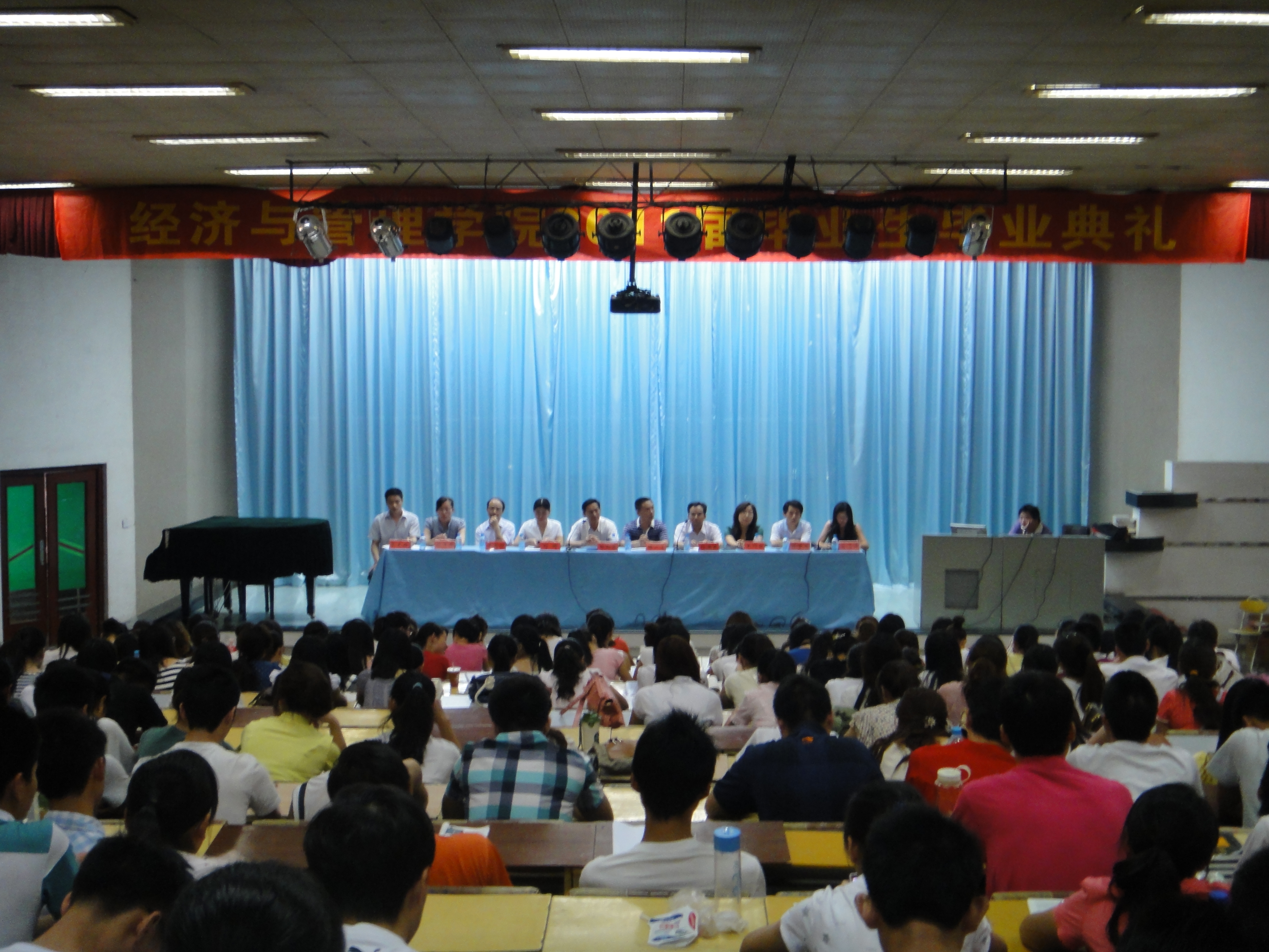 6月15日上午9:00,经济与管理学院2011届毕业生毕业典礼在学校演讲厅隆重举行。经济与管理学院党政班子全体成员出席会议,党政办公室、分团委和学工办负责人、专兼职辅导员、全体毕业生共500余人参加了大会。毕业典礼由经济与管理学院党总支副书记刘洪民主持。