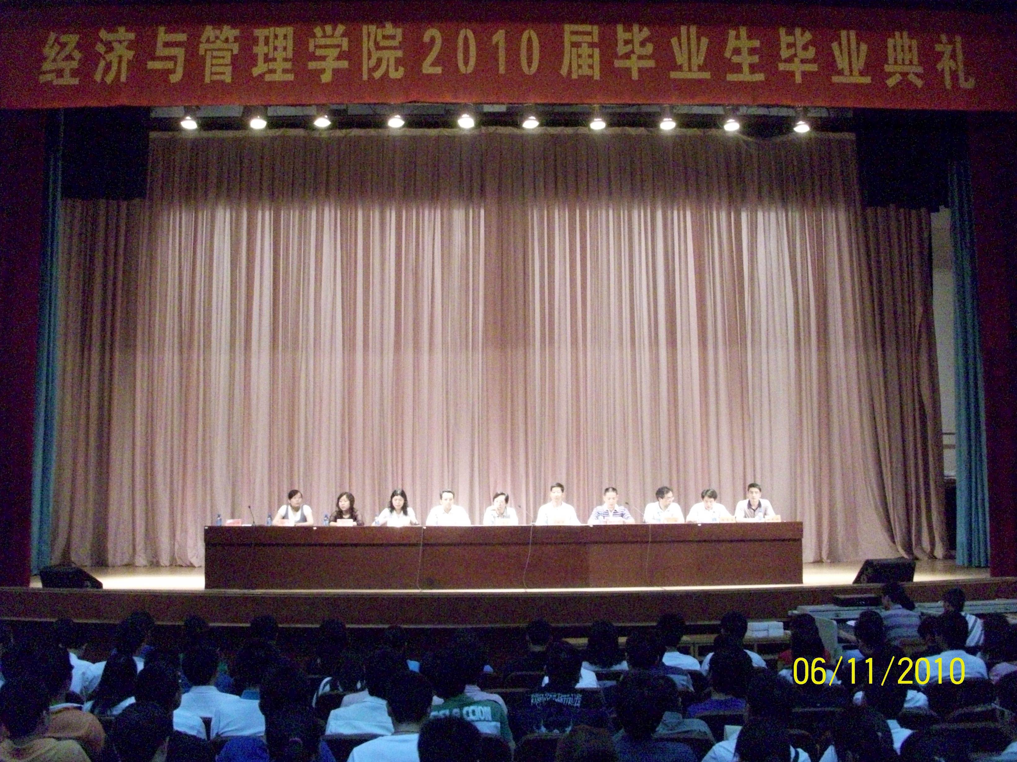 6月11日上午9:00,经济与管理学院2010届毕业生毕业典礼在学校大礼堂隆重举行。经济与管理学院党政班子全体成员出席会议,党政办公室、分团委和学工办负责人、专兼职辅导员、全体毕业生及在校生代表共800余人参加了大会。毕业典礼由经济与管理学院党总支副书记刘洪民主持。